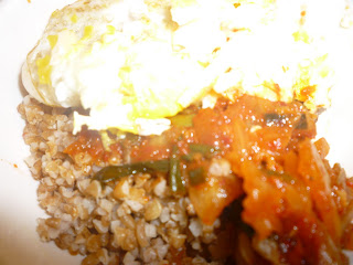 Take cooked, hot rice or bulgar wheat and put in a bowl. Top with the kimchi mixture and then top that with the fried egg. Serve to yourself, stir in the egg so it is mixed into the dish and enjoy!