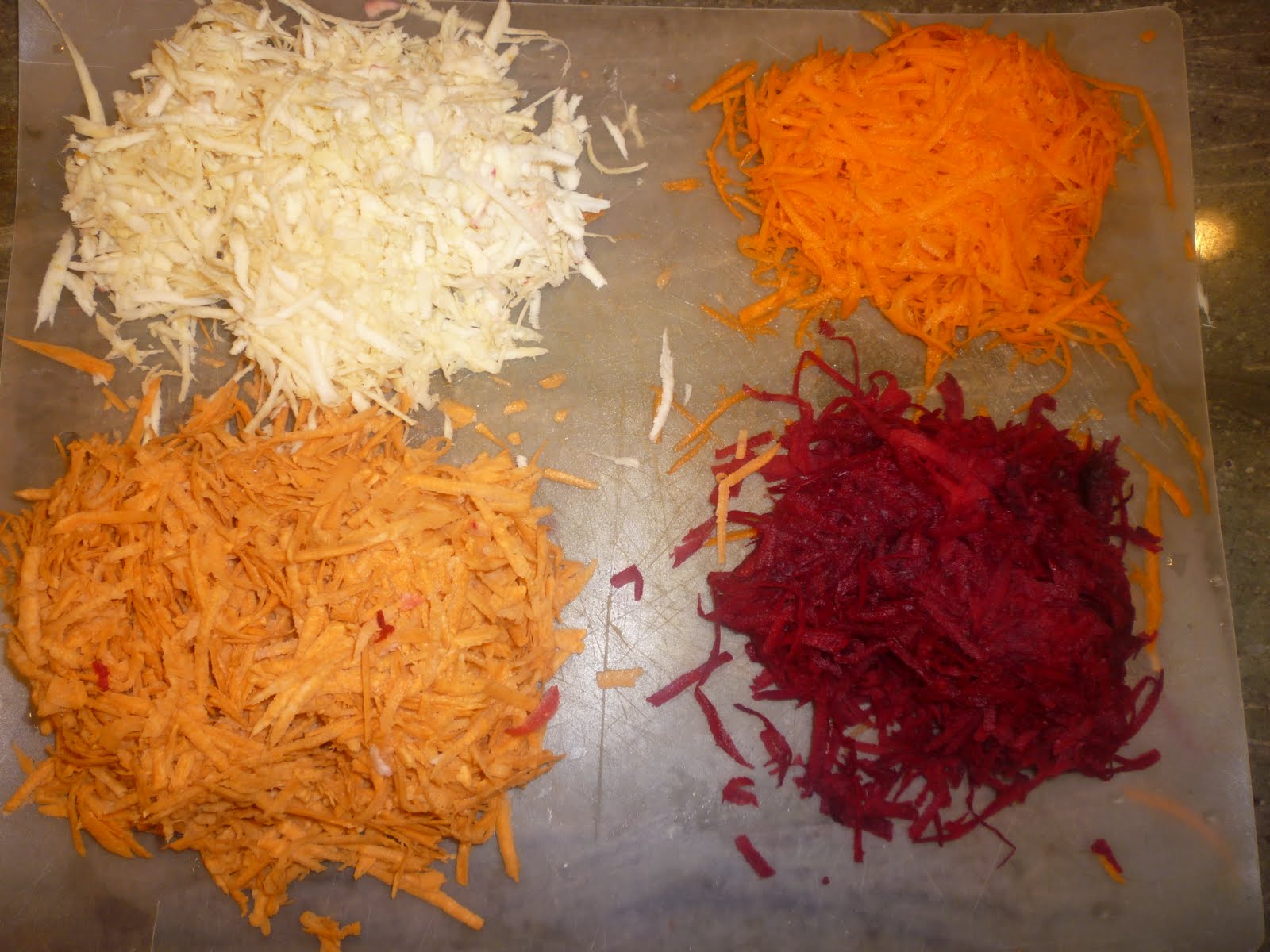 1 large carrot,1 large beet, one medium sized parsnip, one large Yam, all grated in a food processor or hand grater and separated in their own bowls